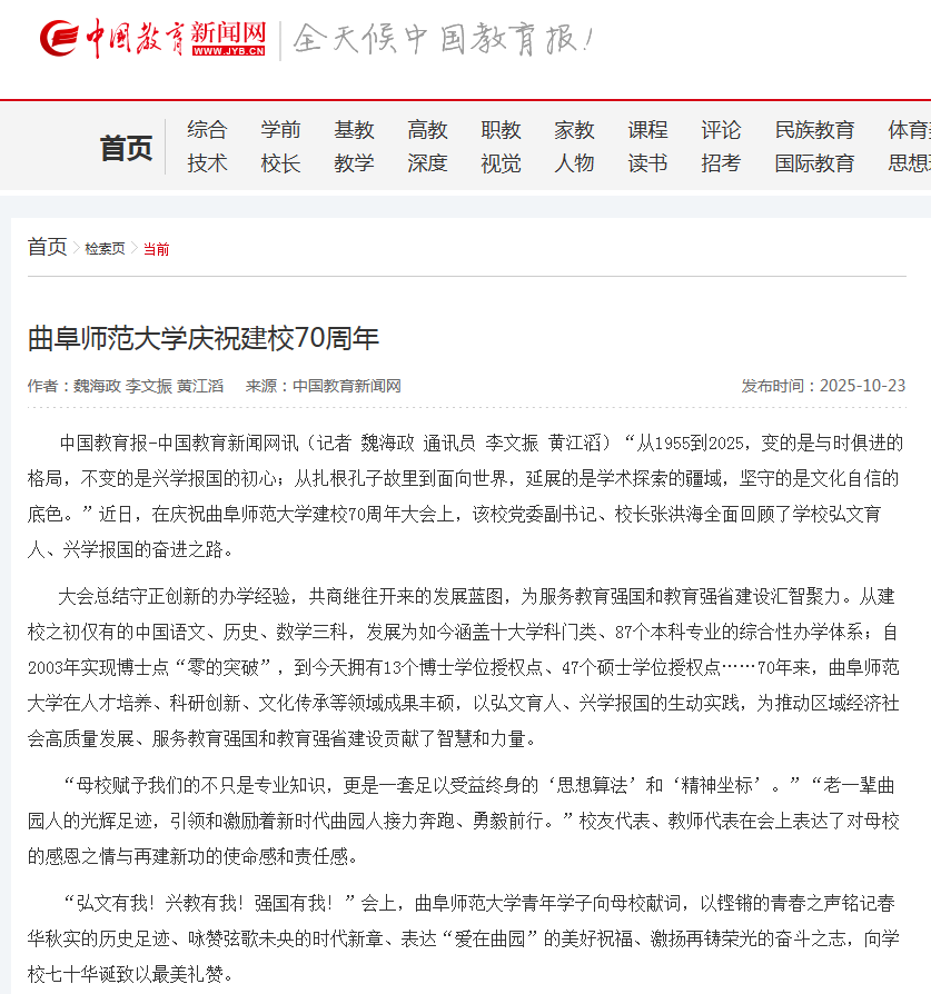 中国教育报-中国教育新闻网讯(记者 魏海政 通讯员 李文振 黄江滔) “从1955到2025,变的是与时俱进的格局,不变的是兴学报国的初心;从扎根孔子故里到面向世界,延展的是学术探索的疆域,坚守的是文化自信的底色。”近日,在庆祝LD平台_LD(中国)一站式服务官网建校70周年大会上,该校党委副书记、校长张洪海全面回顾了学校弘文育人、兴学报国的奋进之路。