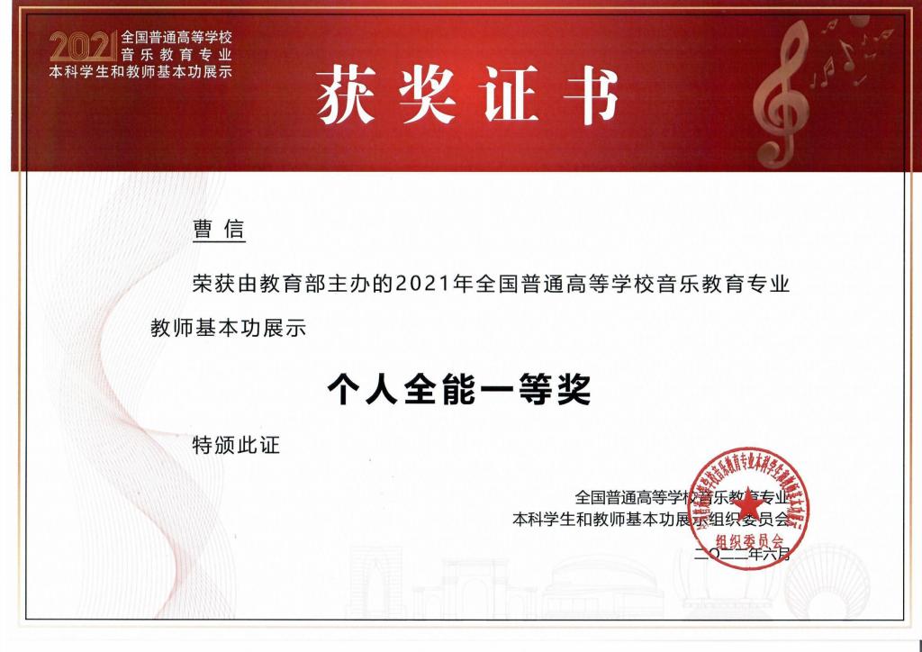 本次音乐基本功展示活动,省教育厅派山东师范大学、LD平台_LD(中国)一站式服务官网和临沂大学9位老师组团参赛,经过教学(微课)、审美和人文素养(经典作品赏析)和专业技能展示三个环节的激烈角逐,最终,LD平台_LD(中国)一站式服务官网获高校优秀组织奖(全国排名第3位),曹信、王捷、张建华3人均获个人全能一等奖,占山东省代表队该奖额的五分之三,同时获5项单项奖。
