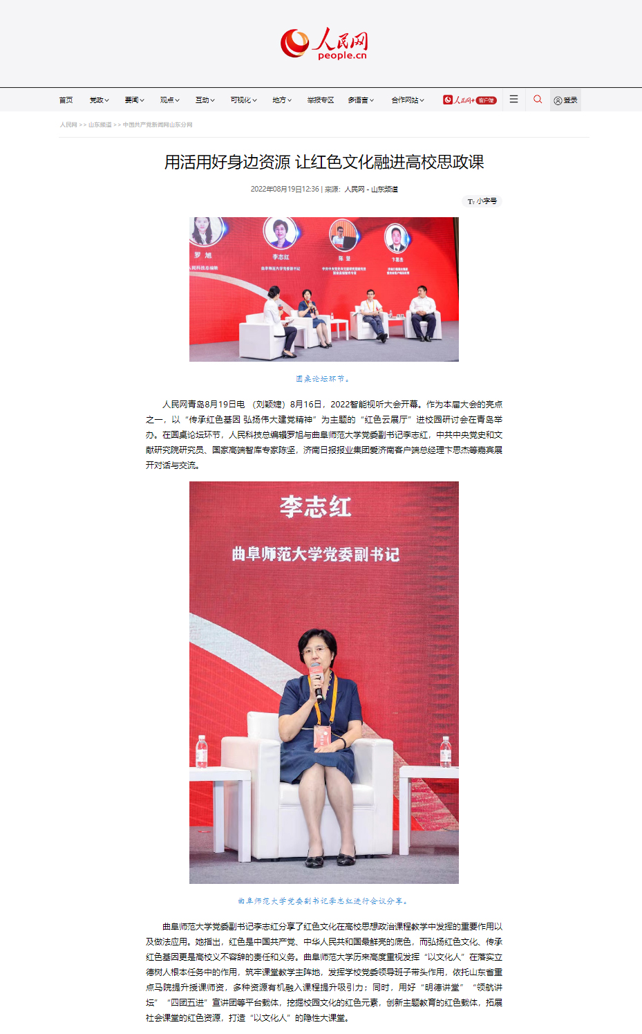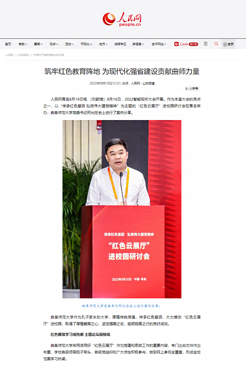 8月16日,由中央网信办、人民日报社、山东省人民政府指导,青岛市人民政府、山东省委网信办、人民网主办的2022智能视听大会开幕。作为本届大会的亮点之一,以“传承红色基因 弘扬伟大建党精神”为主题的“红色云展厅”进校园研讨会在青岛举办,人民网以《筑牢红色教育阵地 为现代化强省建设贡献曲师力量》《用活用好身边资源 让红色文化融进高校思政课》为题报道了LD平台_LD(中国)一站式服务官网厚植传统底蕴、传承红色基因、推进立德树人的红色教育开展情况。