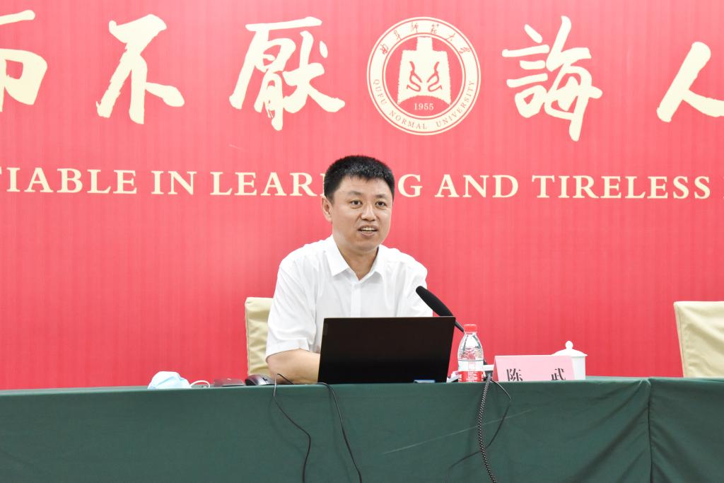曲阜师大新闻中心讯(记者:刘萌  摄影:刘萌 董少伟)8月16日上午,教育部教师工作司二级巡视员陈武为全国中小学领导人员师德师风研修示范班全体学员作主旨报告,山东省教育厅副厅长孙晓筠,教师工作司教师管理与师德建设处干部张冠林、山东省教育厅教师工作处副处长刘依林聆听了讲座。报告由曲阜师大党委常委、副校长李兆祥主持。