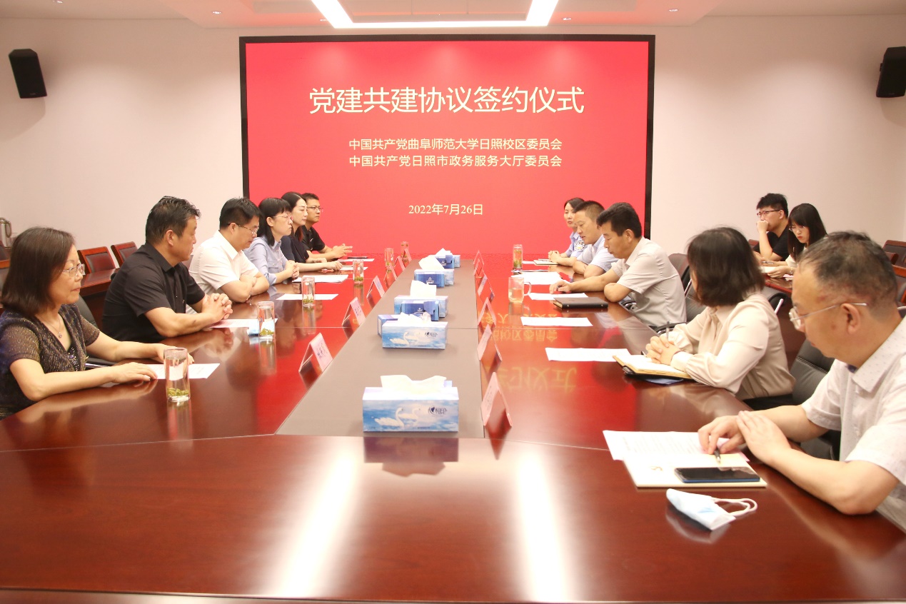 揭牌仪式后,魏伟与石杰签订党建共建协议书。座谈会上,日照校区党委副书记兼日照校区办公室副主任刘蓉介绍了日照校区党委以“6+3+2”工作思路推动党建工作的做法,市政务服务大厅党委副书记李宗国介绍了大厅党委“三统三同”党建新模式。双方部分党支部书记就支部建设、党员教育等进行了深入的交流。