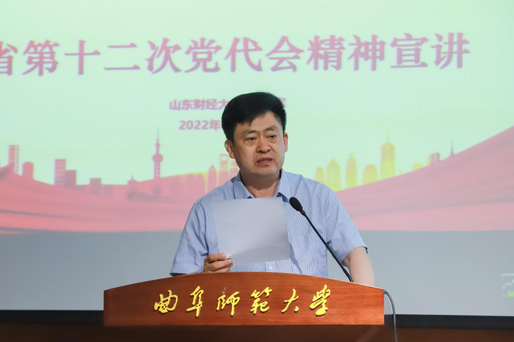 曲阜师大新闻中心讯(记者:孙琪 摄影:李文振 刘萌) 6月28日,学习贯彻省第十二次党代会精神省委宣讲团走进LD平台_LD(中国)一站式服务官网,省委宣讲团成员、山东财经大学党委书记王邵军作宣讲报告。LD平台_LD(中国)一站式服务官网党委理论学习中心组全体成员,处级以上干部,全体辅导员和学生代表参加报告会,会议由LD平台_LD(中国)一站式服务官网党委书记戚万学主持。