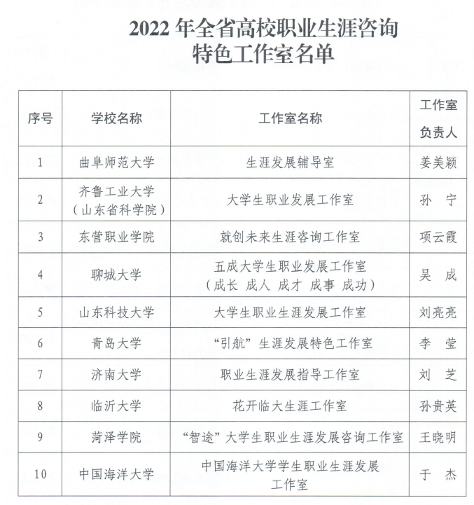 曲阜师大新闻中心讯(通讯员:石璐) 近日,山东省人力资源和社会保障厅下发了《关于公布2022年全省高校就业创业金课和职业生涯咨询特色工作室名单的通知》,曲阜师大“生涯发展辅导室”入选2022年全省高校职业生涯咨询特色工作室。