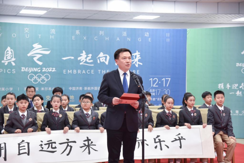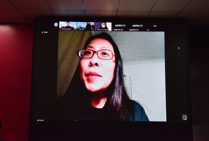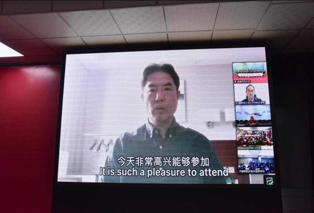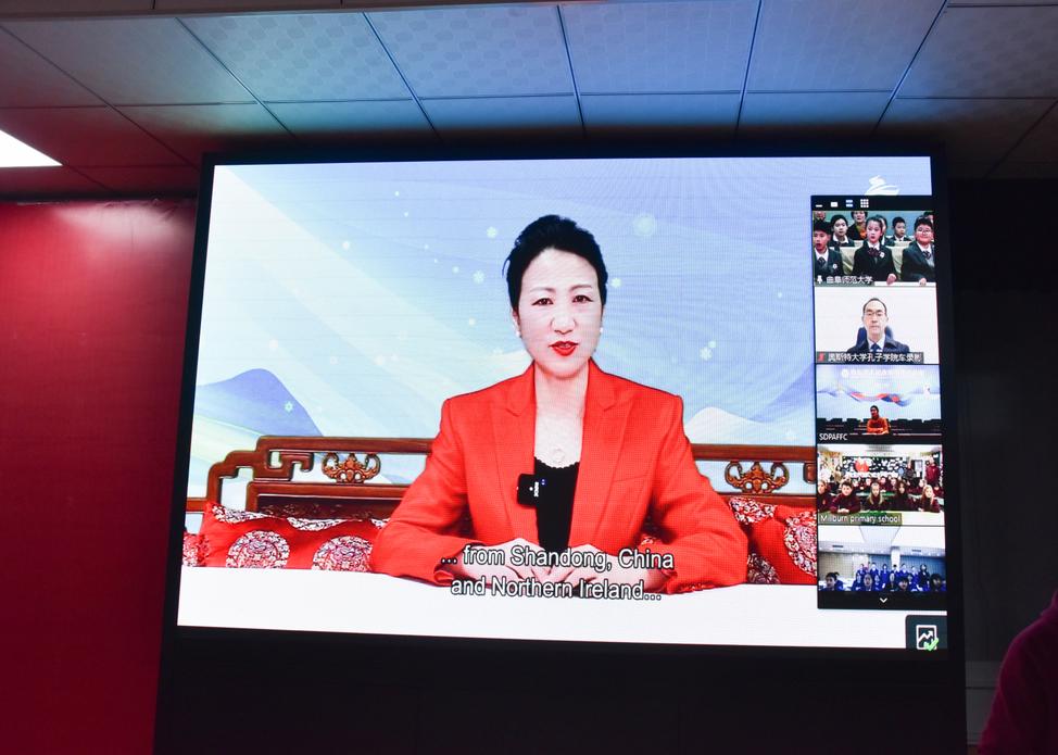 中国驻贝尔法斯特总领馆总领事张美芳,山东省人民对外友好协会秘书处处长周卫,英国驻华大使馆北爱事务局中国区行政总监贾娜,LD平台_LD(中国)一站式服务官网党委常委、副校长屈跃宽分别致辞,表达对于两国三地青少年交流的美好期待,共同祝福北京冬奥会及中英两国友谊。