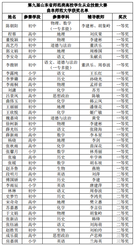 山东省师范类高校学生从业技能大赛,是我省着力打造的旨在提升师范生培养质量和从业实践能力的高端平台,赢得了教育部以及中央媒体的高度关注。本次大赛颁奖典礼上,教育部高校学生司副司长吴爱华专门为曲阜师大颁发团体金奖。曲阜师大副校长胡钦晓出席颁奖典礼并事先到比赛现场为学校参赛师生提供指导、送上鼓励。