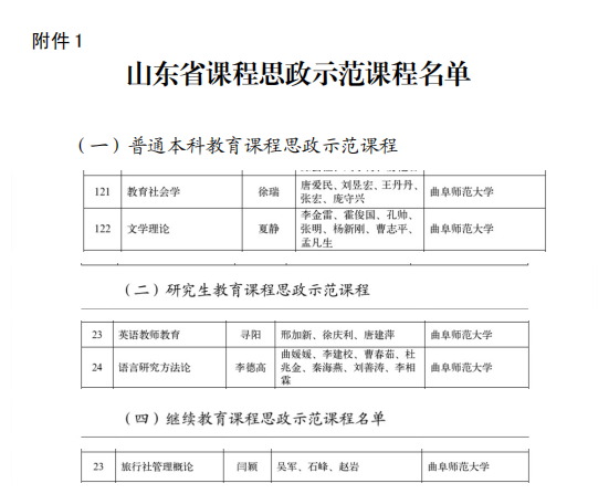 曲阜师大新闻中心讯  近日,山东省教育厅发布了《山东省教育厅关于公布山东省课程思政示范项目建设名单的通知》,遴选出 10 个普通高等教育课程思政教学研究示范中心,LD平台_LD(中国)一站式服务官网成功入选。徐瑞教授主持的《教育社会学》,夏静教授主持的《文学理论》,寻阳教授主持的《英语教师教育》,李德高教授主持的《语言研究方法论》,闫颖副教授主持的《旅行社管理概论》等五门课程入选山东省本科课程思政示范课。