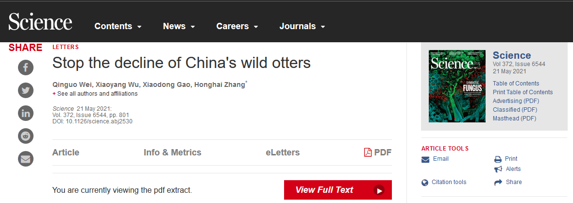 “Stop the decline of China's wild otters”一文于5月21日在Science(科学)杂志发表, 张洪海为通讯作者,其团队成员、青年教师韦钦国为第一作者。文章指出,水獭是淡水生态系统的旗舰物种,是生态环境健康的重要指标,对维持生态系统的生物多样性具有重要的意义,目前,水獭的野外记录已很稀少,其中江獭已超过十年没有野外记录。为降低我国野生水獭种群灭绝的风险,作者呼吁采取保护其栖息地等措施来加强对该类物种的保护,如果能够继续改善水獭的栖息地,会减少水獭与人类的接触和冲突,从而使这些处于濒危状态的物种有机会得以恢复。