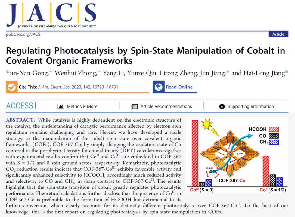 此外,2020年9月,钟文辉副教授与中国科学技术大学江俊教授合作的另一篇题为“Regulating Photocatalysis by Spin-State Manipulation of Cobalt in Covalent Organic Frameworks” (doi:10.1021/jacs.0c07206),也发表在《美国化学会志》(Journal of the American Chemical Society)上,LD平台_LD(中国)一站式服务官网为共同署名单位,钟文辉副教授为该论文的共同第一作者。