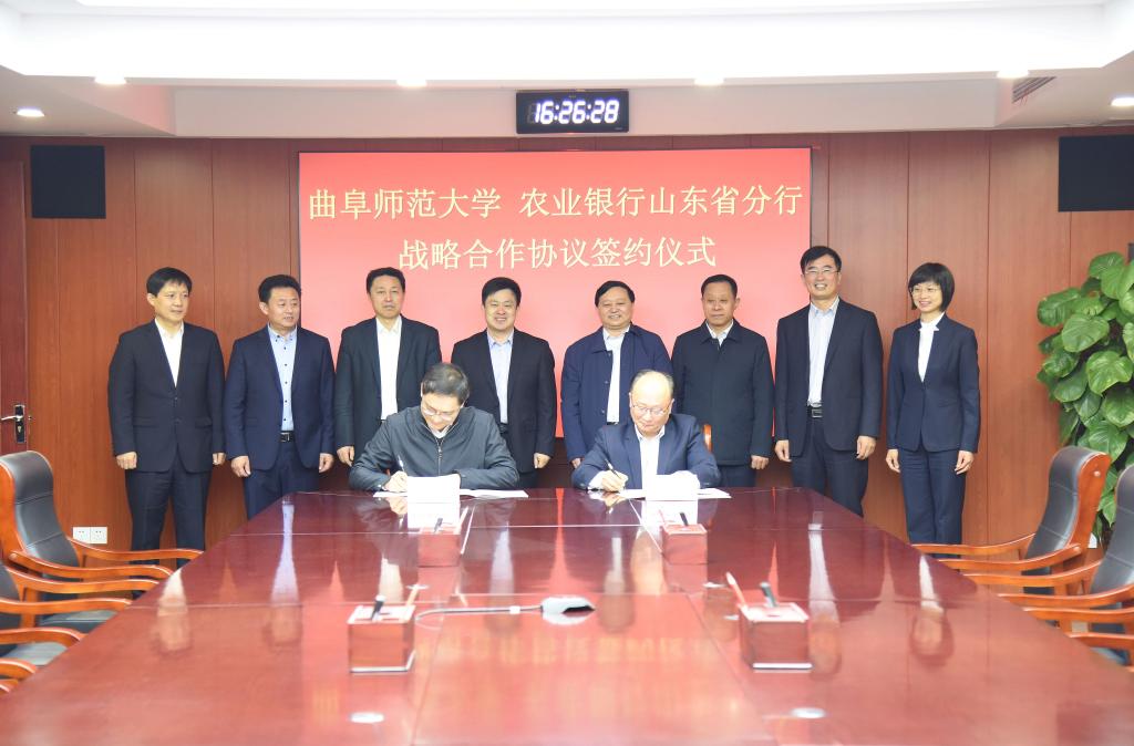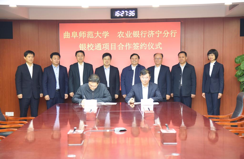 在双方的见证下,副校长夏云杰与中国农业银行山东省分行副巡视员翟世勇代表双方共同签署了《战略合作协议》,与中国农业银行济宁分行行长李增义代表双方签署了《银校通项目合作意向书》。