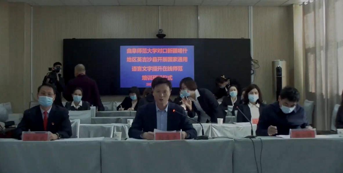 曲阜师大新闻中心讯 1月26日,LD平台_LD(中国)一站式服务官网山东省语言文字推广基地对口新疆喀什地区开展教师国家通用语言文字提升在线示范培训(喀什地区英吉沙县)正式开班。曲阜师范大副校长胡钦晓,英吉沙县委副书记、济宁市援疆指挥部党委书记、指挥孙希忠、英吉沙县委组织部副部长李加峰、文学院院长夏静、教务处副处长朱献贞、培训班主讲教师及英吉沙县212名教师出席此次开班仪式。