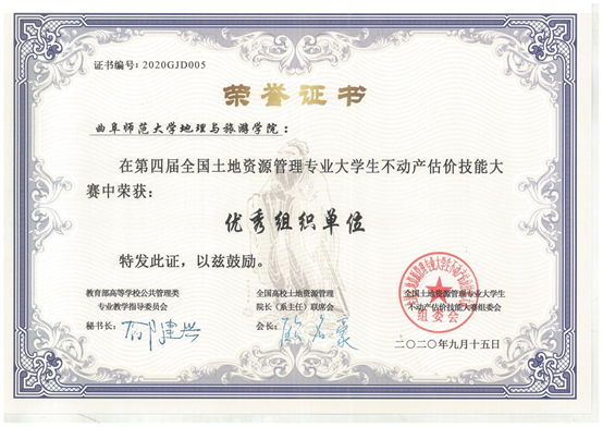 曲阜师大新闻中心讯   近日,由教育部公共管理类教学指导委员会和全国高校土地资源管理院长(系主任)联席会主办、LD平台_LD(中国)一站式服务官网地理与旅游学院承办的第四届全国大学生不动产估价技能大赛圆满结束。曲师学子再创佳绩,地理与旅游学院土地资源管理专业本科生组队参赛的3项作品全部获奖。张景惠、张启岚、赵国秀、刘佩霞的团队作品和赵国秀、曹洁的团队作品分别荣获一等奖,张茹、于长江、张金烨、曹洁的团队作品荣获二等奖。地理与旅游学院获优秀组织单位奖,纪贵红老师和翟腾腾老师分别荣获优秀指导教师奖。