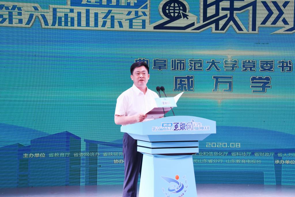 戚万学在致辞中对各参赛团队取得的优异成绩表示祝贺,对本次大赛给予支持的各级领导、专家、投融资机构、企业家、工作人员等致以诚挚感谢。戚万学表示,中国国际“互联网+”大学生创新创业大赛作为贯彻落实党中央创新驱动发展战略的重要举措,是高校落实立德树人根本任务的有效途径,是实现高等教育内涵式发展的重要抓手。本次赛事精彩纷呈、亮点频出,涌现出了一大批有创意、有内涵的优秀创新创业教育成果,展示了新时代大学生创新创业的热情和实力,必将有力地推动全省高校深化产教融合、校企合作,加快高校“双一流”建设和创新发展,为山东省新旧动能转换和教育强省、科技强省建设激发新动力、创造新引擎。曲阜师大将以此为契机,进一步深化创新创业教育改革,努力培养创新创业优秀人才,推出一批科技学术创新成果,推动优秀成果的孵化和转化,更好地服务国家战略和区域经济社会发展;进一步加强与兄弟高校的合作交流,携手推动全省高校创新创业教育迈上新台阶,努力为山东教育事业的发展做出新的更大贡献。