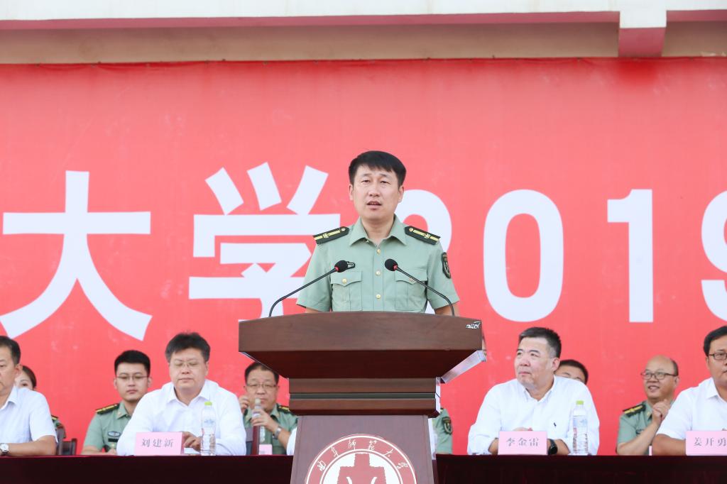 副校长胡钦晓在会上讲话,代表军训旅向全体参训同学们表示热烈祝贺,向全体承训的部队官兵和国旗护卫队的队员表示衷心感谢,向为军训提供保障服务的教职员工表示亲切慰问。胡钦晓指出,军训是同学们步入大学的第一课,大家通过军训感受军威、锤炼身心、熔铸理想,既强健了体魄,又显著提高了自我教育、自我管理、自我服务的能力;军训还是一次深刻的国防教育和爱国主义教育,丰富了大家的国防知识,增强了国防观念,激发了爱国主义热情,培养深化了集体主义和革命英雄主义精神。胡钦晓强调,作为新时代青年学子,同学们要继承革命先辈的优良传统,将军训中激发出的爱国热忱转化为报国之行,做一名有爱国心、强国梦、报国志的曲园学子,以昂扬的斗志、饱满的热情、奋进的姿态,踢好人生的正步,争做堪当复兴大任的时代新人!