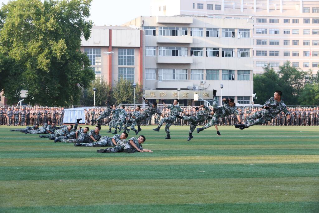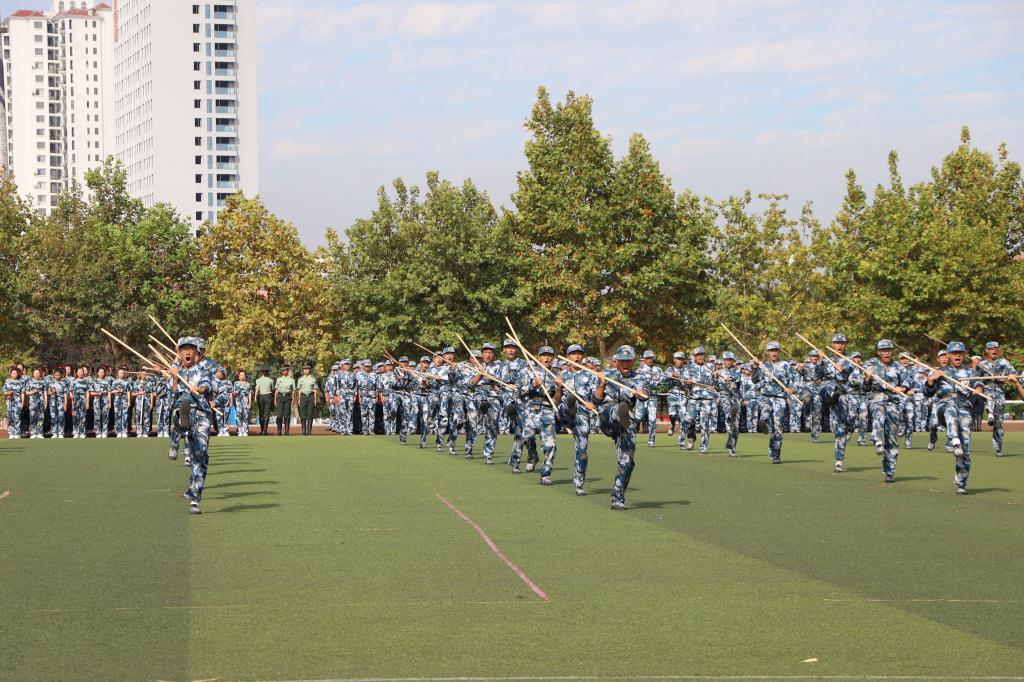 大会在庄严的升旗仪式中拉开帷幕。在随后的军训汇报表演中,一支支方队以铿锵有力的脚步迈入主场接受检阅。站如松,坐如弓,每一个身姿都刚毅挺拔;行如风,目如炬,每一张面孔都精神饱满。跑步方队气贯长虹,擒敌拳方队虎啸山林,心理健康操方队绰约灵动,内务方队利落有序,定向越野方队步伐矫健,棍术方队势如破竹。军训教官带来的倒功格斗和战地救护表演尽显英雄气概,赢得阵阵欢呼。