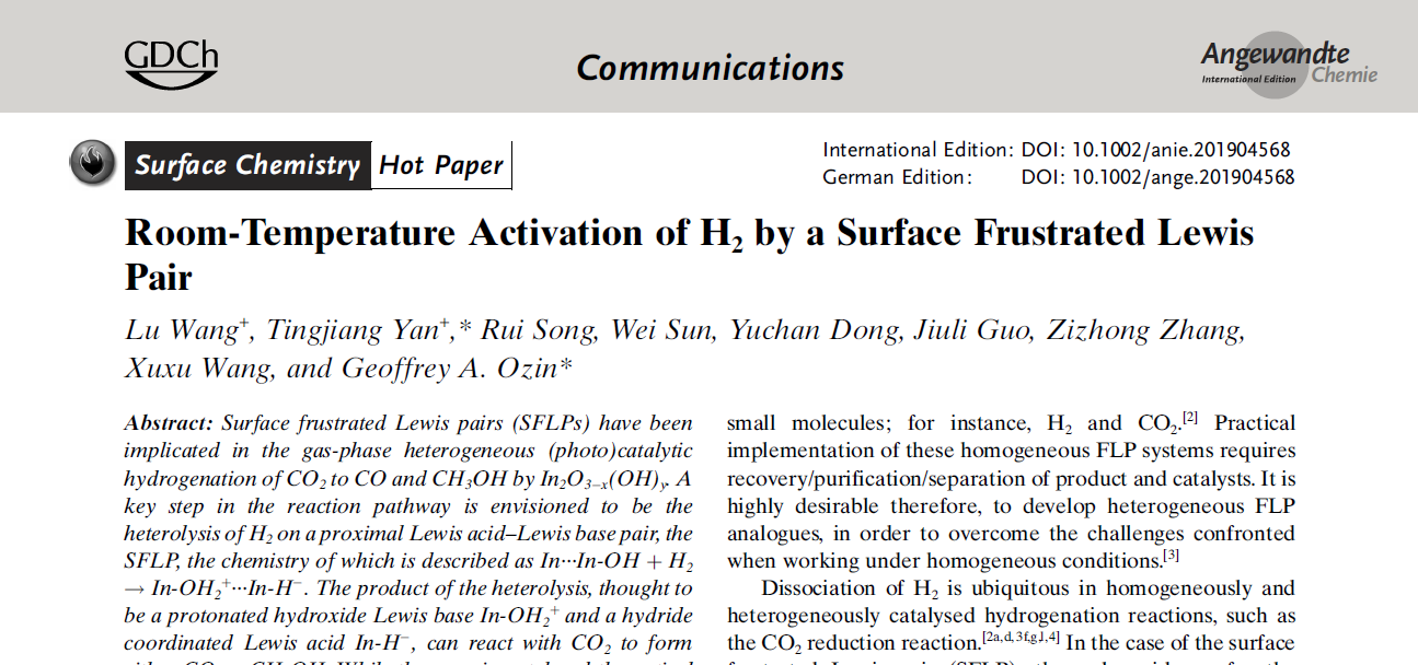 第一篇论文为“Polymorph selection towards photocatalytic gaseous CO2 hydrogenation”(DOI:10.1038/s41467-019-10524-2)发表在《自然》子刊《Nature Communications》上,颜廷江教授为该论文的第一作者与通讯作者,LD平台_LD(中国)一站式服务官网为第一署名单位;第二篇论文为“Room-Temperature Activation of H2 by a Surface Frustrated Lewis Pair”(DOI:10.1002/anie.201904568)发表在化学领域顶级期刊《Angewandte Chemie International Edition》,并被编辑选为“Hot Paper”,颜廷江教授为共同第一作者与通讯作者,LD平台_LD(中国)一站式服务官网为共同署名单位。