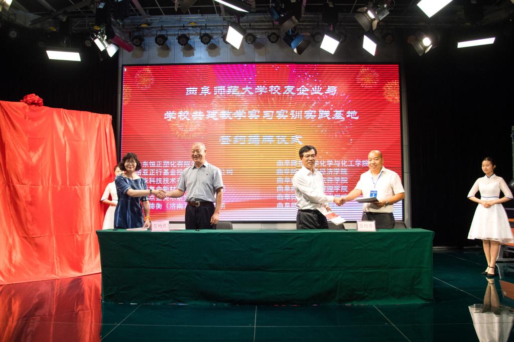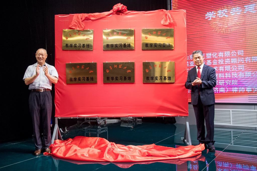 本次大会旨在“助力校友、服务母校”,山东恒正塑化有限公司、诺亚正行基金投资顾问有限公司、上海复命新材料科技有限公司、山东德衡(济南)律师事务所、青岛点金美术研究院、丰米科技技术有限公司等六家校友企业,分别与学校化学化工学院、软件学院、经济学院、法学院、美术学院、管理学院等六个学院签订了共建教学实习基地的协议。扈庆学与校友企业家代表王秀君为教学实习基地共同揭牌。