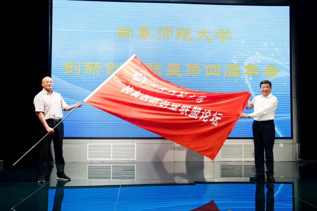 大会举行了会旗交接仪式,联盟理事长刘德明向第四届校友创新创业论坛的承办单位北京校友会授旗,北京校友会常务副会长侯文生在仪式上接过会旗。