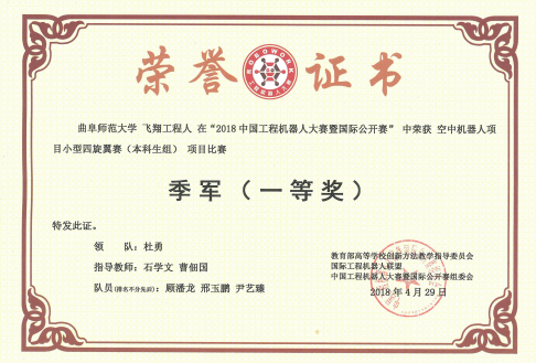 近日,由教育部高等学校创新方法教学指导委员会等单位联合举办的“2018中国工程机器人大赛暨国际公开赛”举行。由我校工学院顾潘龙、邢玉鹏、尹艺臻同学组成的“飞翔工程人”队,在石学文、曹佃国老师指导下,荣获“空中机器人项目小型四旋翼赛(本科生组)”项目比赛全国季军(一等奖)。