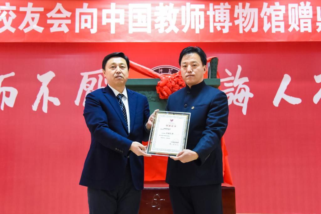 捐赠仪式正式举行前,学校党委书记戚万学会见了河南校友会会长、中油物流有限公司董事长、我校文学院1981级优秀校友柴继峰一行。戚万学对柴继峰一行重访母校表示热烈欢迎,对河南校友会关注支持教师博物馆建设并捐赠司母戊鼎表示衷心感谢,介绍了学校建设孔子家乡一流大学的发展成就和中国教师博物馆的建设规划,希望河南校友会的校友们常回母校看看,一如既往关注、关心母校的建设和发展,同时提前为大家送上美好的新春祝福。柴继峰表达了对母校感恩之情,表示将继续尽己所能为母校事业发展贡献力量,并代表河南校友会的广大校友表达了对母校的美好祝愿。