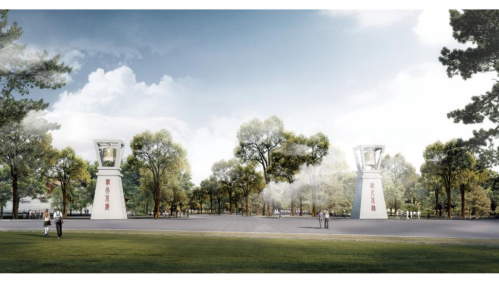 为了彰显校区形象,加强对新校区南入口的引导,在东西校区中间,城市主干道静轩西路上设置引导性景观。放置以阙为原型,以校徽校训为主题的景观元素,突出展示学校形象,也与共享体育休闲带一同有机融合了新旧校区,形成一个和谐整体的校园环境。