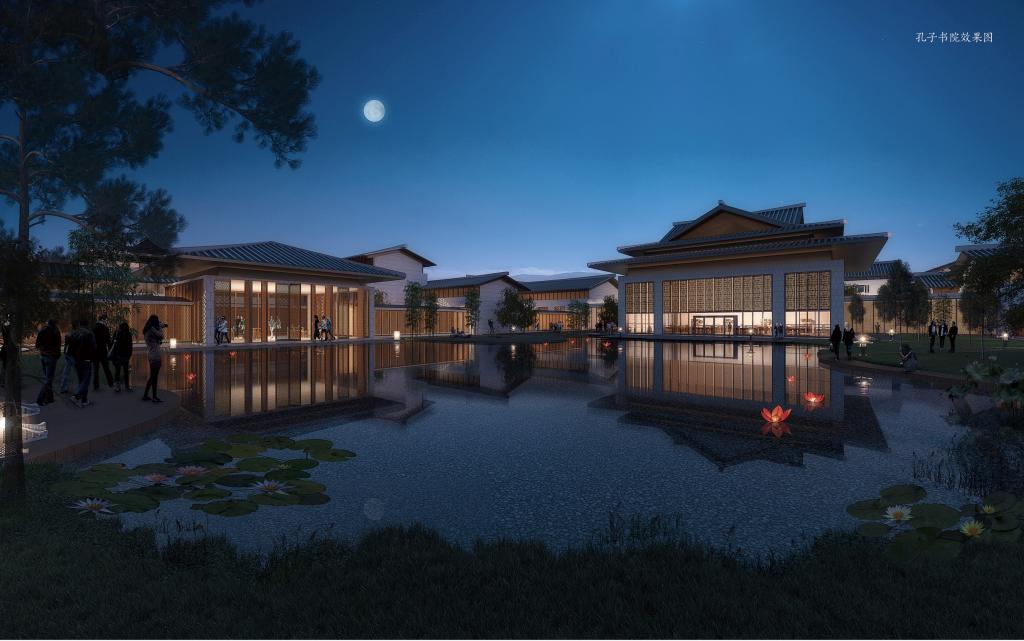以孔庙杏坛为范式,孔子书院的大堂空间采用重檐十字脊顶,形成强有力的集聚性形态,成为建筑群落的核心标志。宿舍客房围绕一湾浅池布置园林景观,充满诗情画意。