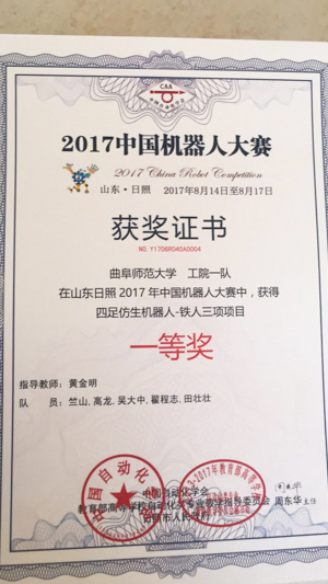 8月17日,由中国自动化协会、日照市人民政府主办的2017中国机器人大赛在山东日照落下帷幕。在指导老师黄金明、周士贵的带领下,我校工学院竺山、顾潘龙、高龙等同学组成的三支参赛队伍,凭借过硬的专业能力和出色的现场发挥取得优异成绩,在四足仿生机器人——铁人三项项目中斩获国家一等奖1项、二等奖1项,在四足仿生机器人——协作搬运项目中获得国家一等奖1项。