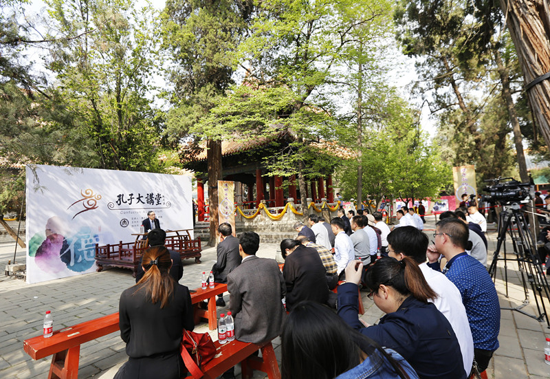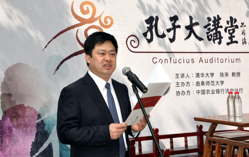 校长戚万学在开讲仪式上致辞,他说:“今天,我们心怀敬仰,在大成殿前、杏坛之上共同开启‘孔子大讲堂’的帷幕。第一讲,我们非常荣幸地邀请到了当代著名哲学家、哲学史家、中央文史研究馆馆员、中国哲学史学会会长、孔子文化奖获得者、山东省特聘‘儒学大家’,当代儒学研究的旗帜性学者陈来先生主讲。”