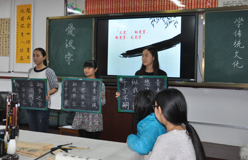 “青青子衿,悠悠我心”的吟唱中,班会正式开始。班长王晓晖就班级围绕“中文专业师范生基本功培养”,开展钢笔字、粉笔字、毛笔字和普通话训练活动作了简要介绍。同学们现场与大家分享了练字心得,进行硬笔、软笔书法展示。在普通话汇报环节,同学们共同吟诵一首英文诗歌的几种汉语翻译版,更具体、深入地展示了汉语之美。