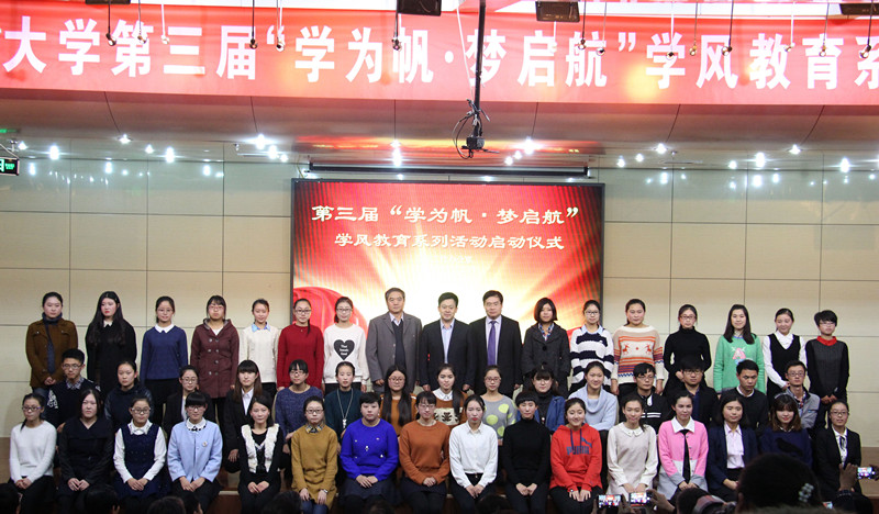 12月8日,第三届“学为帆•梦启航”学风教育活动启动。45名专业成绩第一名学生受到表彰,校长戚万学亲切会见受表彰同学并与他们合影留念,勉励同学们刻苦读书、亲近经典,“使读书成为一种习惯和生活方式,让校园里涌现出更多的学霸、学神”。
