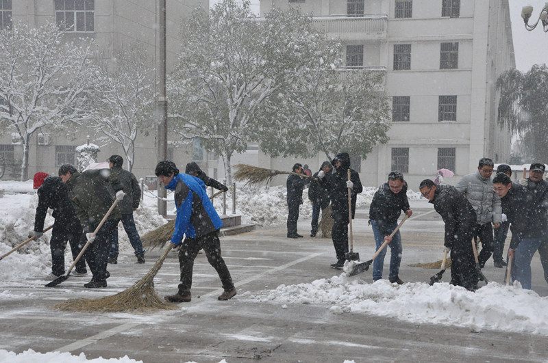 25日下午,全校师生纷纷行动起来,大家走出教室和办公室,来到校园各处,或用铁锹铲除路面积雪,保障道路通畅;或用竹竿敲打树木积雪,为不堪重负的名贵树木减负。
