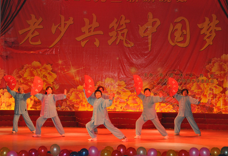 晚会在老年艺术团高亢嘹亮的合声中拉开了序幕。傣族健身舞《春的律动》展现了老同志不老的青春姿态,《我的家乡沂蒙山》、《洪湖水浪打浪》等合唱表达了深深的赤子之情。来自韩国的朴仁淑女士,用韩语演唱了京剧《苏三起解》,赢得现场观众的阵阵欢呼。《回娘家》编排新颖,亮点频出;激情四射的斗牛舞传递了如火的热情,点燃全场,将晚会推向高潮。更有中文剧社的小品《奉承》,以其幽默的台词,出色的表演博得观众的青睐,全场欢笑连绵,掌声不断。晚会在书法学院现场创作的书画作品《兰亭序》后,圆满落幕。