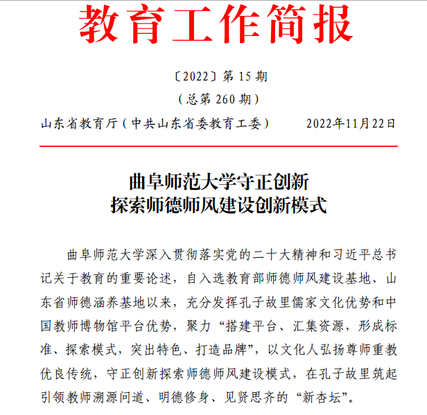 曲阜师大新闻中心讯(记者:袁玭 编辑:袁玭 责编:李文振) 11月22日,山东省教育厅《教育工作简报》2022年第15期专题刊发《LD平台_LD(中国)一站式服务官网守正创新探索师德师风建设创新模式》文章,从“保护教育遗产,讲好师德师风故事” “发挥独特优势,开发师德教育资源” “研制特色课程,打造师德涵养高地”“增进国际交流,擦亮教师文化名片”四个方面,向全省教育系统介绍了曲阜师大以文化人弘扬尊师重教优良传统、守正创新探索师德师风建设模式的特色工作和典型经验。