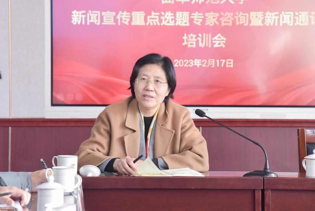 曲阜师大党委宣传部讯 为推动挖掘视角、传播方式、话语风格创新,讲好守正、进取、创新、活力“四个曲阜师大”,2月17日,曲阜师大召开新闻宣传重点选题专家咨询会暨新闻通讯员培训会,光明日报、中国教育报、山东广播电视台、大众日报、清华大学党委宣传部等媒体和高校新闻宣传工作的专家做了指导。学校党委副书记李志红出席会议并讲话,党委常委、宣传部部长孙祥广主持会议。