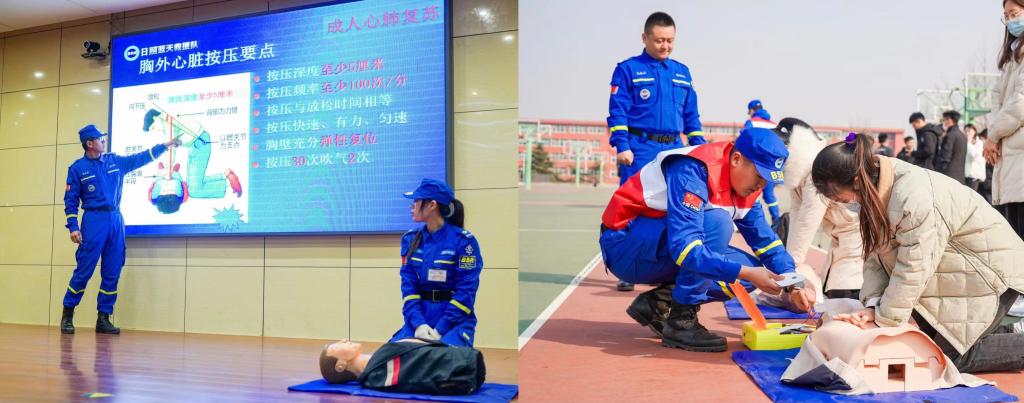 日照市蓝天救援队队员为受聘为安全守护员的同学们开展了应急救护知识与技能实操培训。在模拟实操中,同学们就地分组,在培训教官的带领下进行实操训练。教官们悉心指导,同学们积极参与,很快就掌握了心肺复苏急救的动作要领。