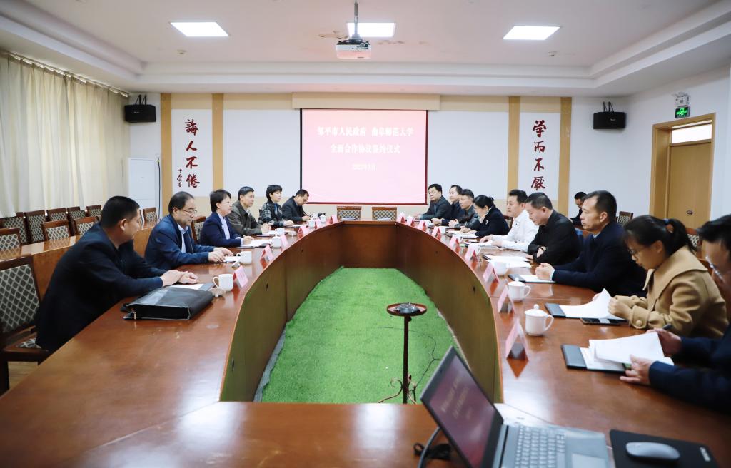 纪洪涛介绍了学校的基本情况、发展历程,重点介绍了学校办学过程中形成的尊师、弘文、乐学、崇实的深厚积淀和在科学研究、教书育人方面取得的重要成果。并表达了学校与邹平市政府携手,资源共享、优势互补,开辟共进共赢的良好格局的希望。