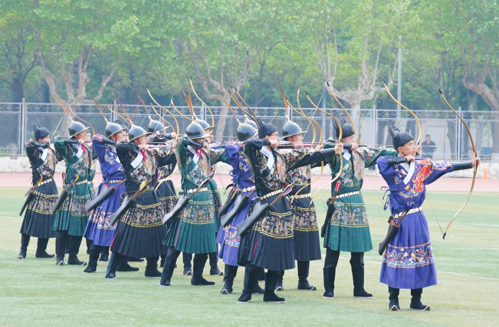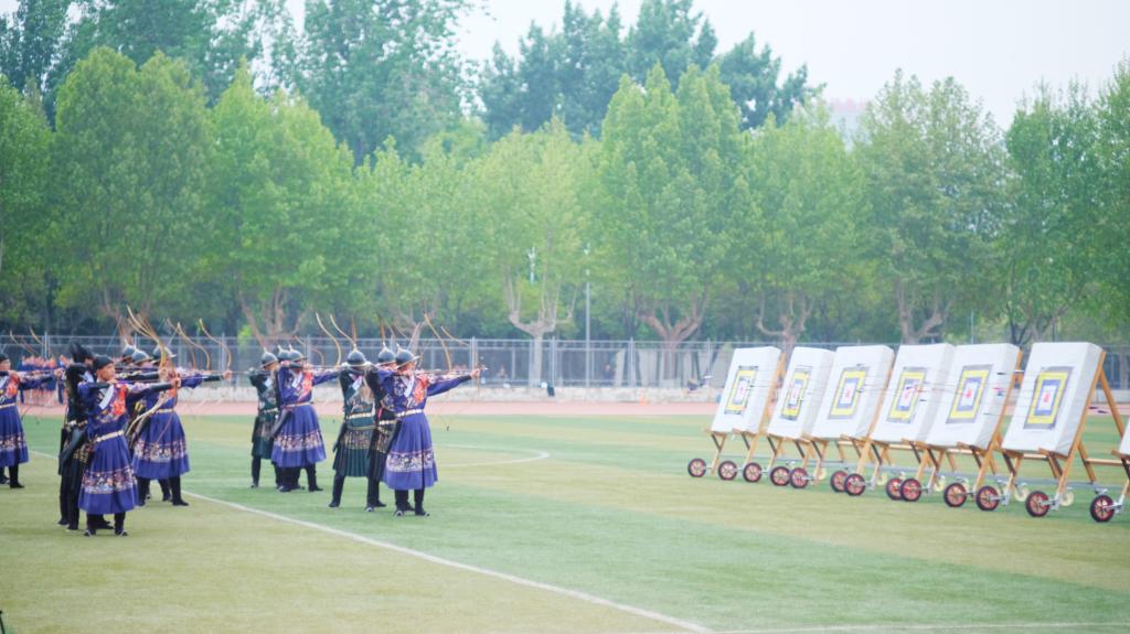 精彩纷呈的学生团体才艺表演将本次运动会开幕式推向高潮。体育科学学院的射艺表演,礼乐相和,在充满古韵的琴乐中,同学们变换阵型,以雄浑气势震撼四座;音乐学院学子的礼仪操表演,整齐的服装、挺拔的身姿、甜美的微笑、优美的体态,成为了赛场上一道靓丽的风景线;啦啦操社团带来了青春洋溢的啦啦操表演,时尚动感的旋律舞出了青春激情,唱响了青春赞歌;最后,由13个学院共793名学生组成的庞大体操方阵,展示了第九套广播体操表演,同学们迈着自信的步伐,把青春的活力带到操场的每一个角落。