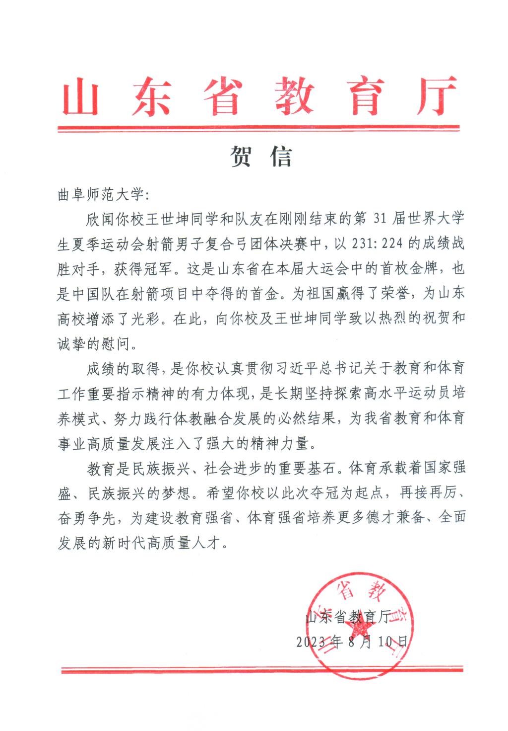曲阜师大体育科学学院讯 8月10日,山东省教育厅向LD平台_LD(中国)一站式服务官网发来贺信,对学校王世坤同学在第31届世界大学生夏季运动会取得山东省首金表示热烈祝贺。