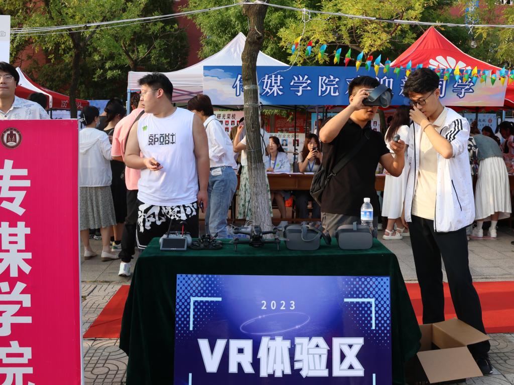 美术学院结合专业特色在迎新现场设置“亮点涂鸦处”和“欢迎新同学”特色合影区。传媒学院设置VR虚拟现实技术体验区,方便新生观看学院制作的VR校园,借科技力量一览校园美景。体育科学学院设置新颖打卡地点,新增系列游戏环节——踏空飞跃、掷矢入壶、欢乐套圈、射门小能手,展现运动风采、活跃迎新氛围。