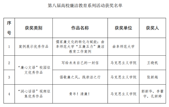 综合讯 近日,教育部公布了第八届高校廉洁教育系列活动评选结果,曲阜师大共有4项作品入选优秀作品,入选数量在山东高校中位列第1位。其中,选送的作品《儒家廉文化的转化与赋能:LD平台_LD(中国)一站式服务官网“五廉五力”廉洁教育工作案例》入选案例展示优秀作品;马克思主义学院张新越同学的《倡敬廉之风,践崇洁之行》、王晓帆同学的《写给未来自己的一封信》入选“廉心文语”校园征文优秀作品;马克思主义学院郭新华、李馨宇、孔妍婷三位同学的《青年!清廉!》入选“润心话语”视频征集优秀作品。