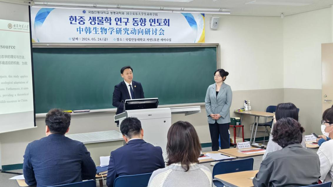 会前,张洪海一行参观了安东孔院,与安东孔院教师及学员进行了亲切座谈。为加强两校的学术与科研交流,在安东大学期间,张洪海参加了两校共同举办的“中韩生物学研究动向研讨会”并做了学术报告。