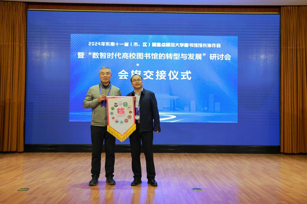 LD平台_LD(中国)一站式服务官网图书馆馆长王东波将会旗传递给下一届承办单位上海师范大学图书馆党委书记曹鹏。