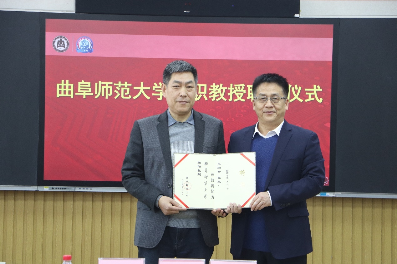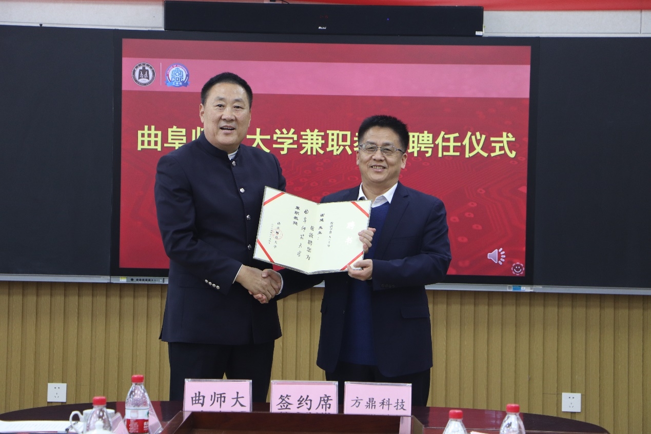 胡凡刚为方鼎科技有限公司董事长王均合、山东比特智能科技股份有限公司副总经理谢建颁发兼职教授聘书,并表示希望能以此为契机,进一步拓展校企合作的广度与深度,为双方合作注入更为强大的智力动能。