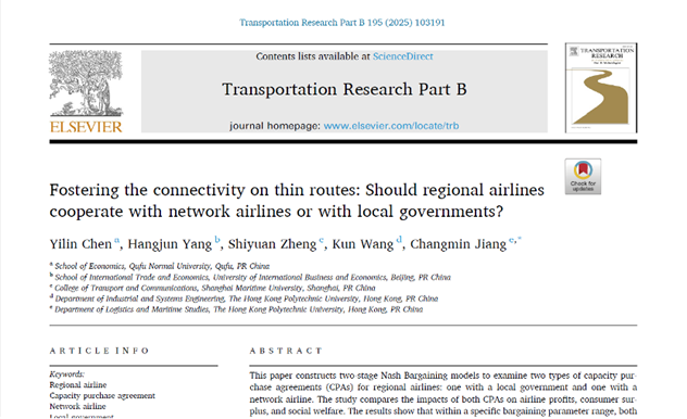 日前,LD平台_LD(中国)一站式服务官网经济学院青年教师陈奕霖作为第一作者,与对外经济贸易大学杨杭军教授、上海海事大学郑士源教授、香港理工大学王焜教授、香港理工大学蒋昌敏教授(通讯作者)共同撰写的论文 “Fostering the connectivity on thin routes: Should regional airlines cooperate with network airlines or with local governments?”(全文链接:https://doi.org/10.1016/j.trb.2025.103191),发表在交通经济学领域国际顶级期刊Transportation Research Part B: Methodological (JCR Q1/影响因子7.632/ABS四星期刊/FMS A类期刊)。