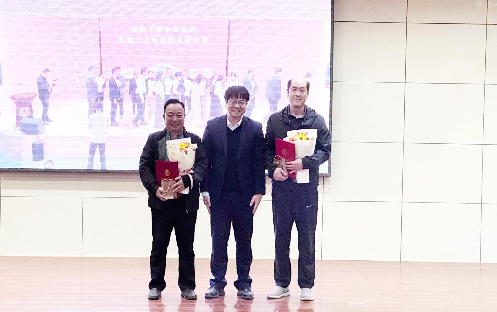 党委副书记、校长张洪海在曲阜校区为从教三十年教师代表颁发荣誉证书