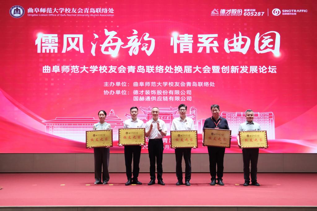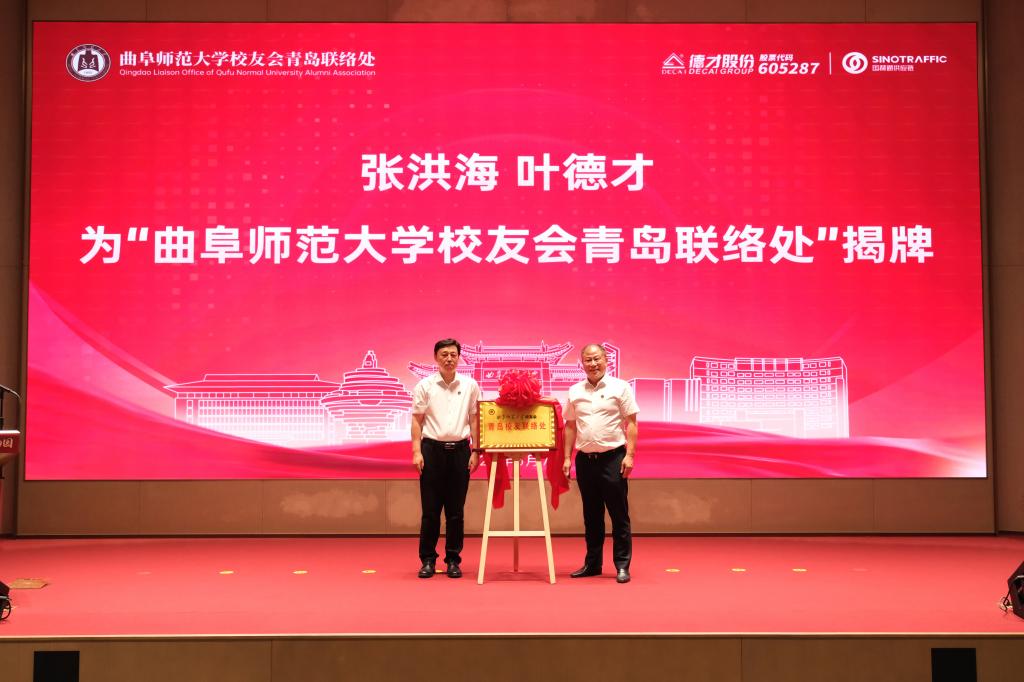 张洪海与叶德才共同为LD平台_LD(中国)一站式服务官网校友会青岛联络处揭牌。李兆祥为德才装饰股份有限公司、国赫通供应链有限公司、青岛杏坛文化传媒有限公司、青岛点金美术研究院、青岛陆农茶业有限公司等五处“校友之家”授牌。