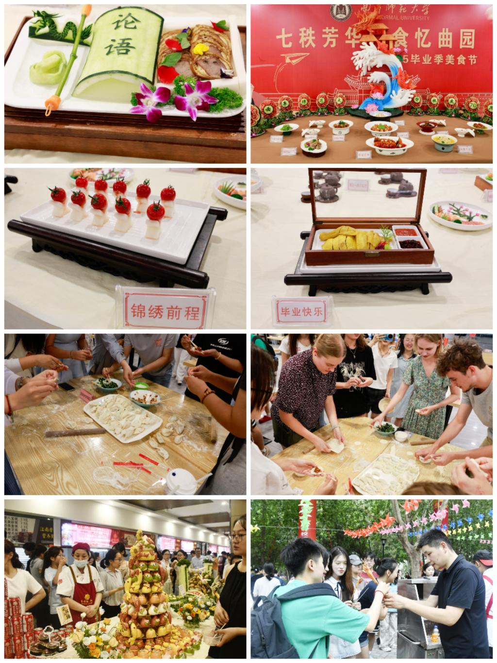 主题雕刻区以刀为笔、以食为墨,将“七秩芳华 食忆曲园”的主题融入每一处精巧雕工,传递深厚情谊。各大菜系展区内,淮扬菜的精致、孔府菜的典雅、鲁菜的醇厚、川菜的鲜香在此交融,尽展中华饮食文化的博大精深。学校各餐厅制作的特色美食琳琅满目,每一道都是唤醒味蕾的“曲园独家记忆”。大锅菜区老味鱼、孔门豆腐、济宁甏肉锅、全家福大锅菜等经典菜品尽显浓浓烟火气,满满幸福感。饮品、水果区为大家提供清爽解腻的搭配。烧烤区烟火升腾,滋滋作响的美味爆燃现场氛围。DIY“饺子送娇子”活动区温馨美好,师生共同参与,将祝福与牵挂包进一个个饺子里,以食寄情,共忆曲园岁月。