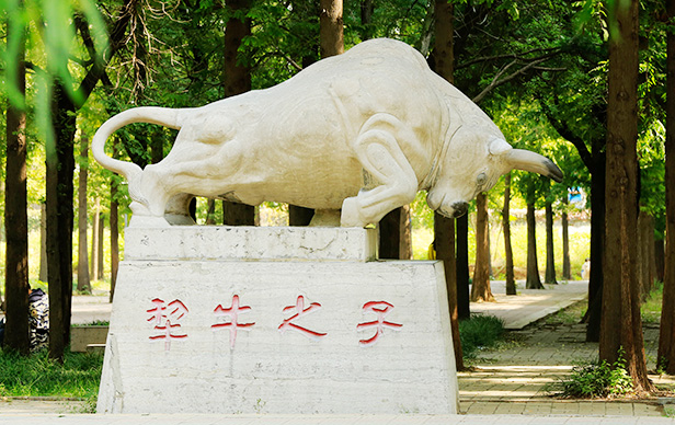 沿着东侧林荫道往南走,发现了一座“犁牛之子”的雕像,石雕的牛非常有张力,雕像的创意来自中文系的张元勋教授,成语出自《论语雍也》子谓仲弓,曰:“犁牛之子骍且角。虽欲勿用,山川其舍诸?”张教授对屈原颇有研究,讲课富有激情,经常有别系的学生来旁听,人满为患。我们最后来到了萃华园,当时还有围墙,现在是开放式的了,小桥、假山、大门还在,增加了荷花、喷水池,花园门前的图书馆成了校史馆了。记得图书馆西边墙山高处是包备武先生书写的“图书馆”三个大字。目前在萃华园北的图书馆名是赵朴初先生题写的。