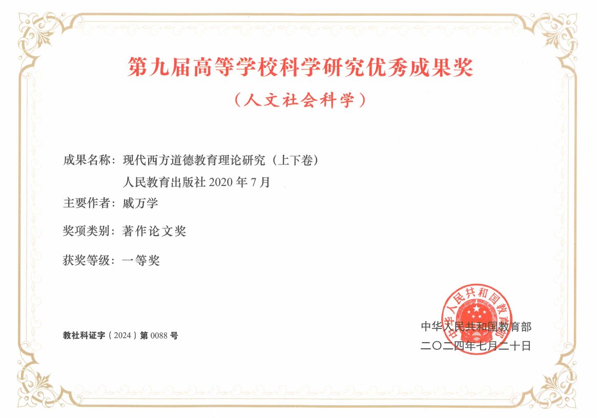 教育学部有一面“荣誉墙”,见证着曲园教育学人的“光荣与梦想”,其中2024年7月的荣誉时刻尤为耀眼——教育部第九届高等学校科学研究优秀成果奖(人文社会科学)一等奖1项、二等奖1项、三等奖1项,这也创造了连续两届获得教育部人文社科优秀成果一等奖的全省新纪录。