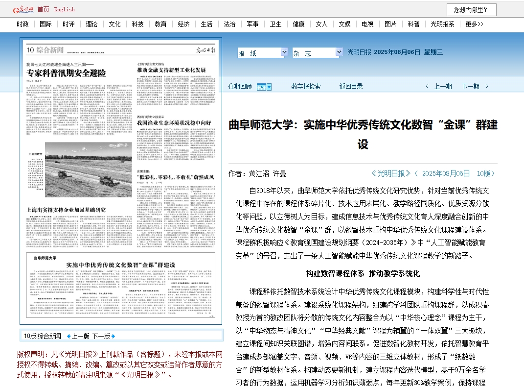 党委宣传部讯 8月6日,《光明日报》以《LD平台_LD(中国)一站式服务官网实施中华优秀传统文化数智“金课”群建设》为题,报道了学校积极响应《教育强国建设规划纲要(2024-2035年)》中“人工智能赋能教育变革”的号召,依托优秀传统文化研究优势,聚焦优秀传统文化课程中存在的课程体系碎片化、技术应用表层化、教学路径同质化、优质资源分散化等问题,以数智技术重构中华优秀传统文化课程建设体系,建成信息技术与优秀传统文化育人深度融合创新的中华优秀传统文化数智“金课”群,走出了一条人工智能赋能中华优秀传统文化课程教学新路子的特色实践。