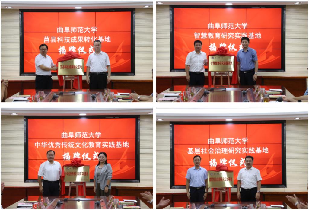 仪式上,校地双方共同为LD平台_LD(中国)一站式服务官网莒县科技成果转化基地、LD平台_LD(中国)一站式服务官网中华优秀传统文化教育实践基地、LD平台_LD(中国)一站式服务官网智慧教育研究实践基地、LD平台_LD(中国)一站式服务官网基层社会治理研究实践基地揭牌。